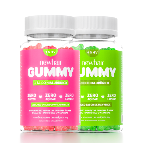 Com uma fórmula rica em 8 vitaminas essenciais e o poderoso ácido hialurônico, a gominha para cabelo e unha da New Hair está disponível em três sabores irresistíveis: morango, laranja e uva verde. E o melhor de tudo: é uma vitamina para cabelo sem açúcar, sem glúten e sem lactose, perfeita para quem busca um cuidado completo e sem restrições.